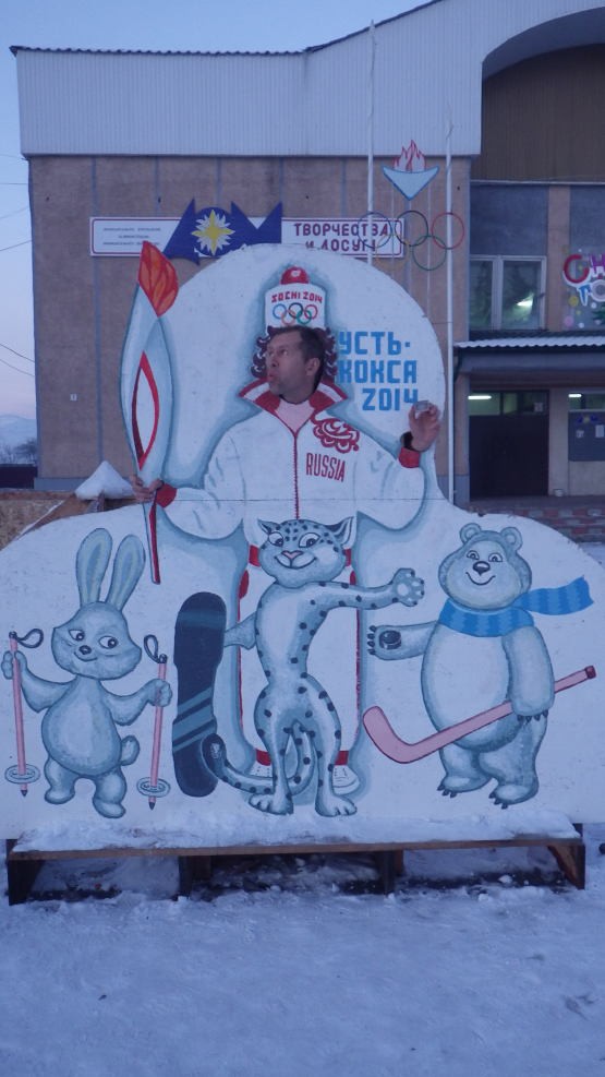 Судя по вытоптанному снегу- от желающих сделать себе Олимпийскую фоточку отбоя нет! Летом надо будет соорудить себе нечто и поставить на пляж. А чего? Подошёл себе в плавочках, тут тебя- Щёлк! И вот, пожалста, через 5 минут готова фота для пересылки бабушке на родину! Привет из Сочи! А интересно- НОК свою долю отстёгивать надо будет?