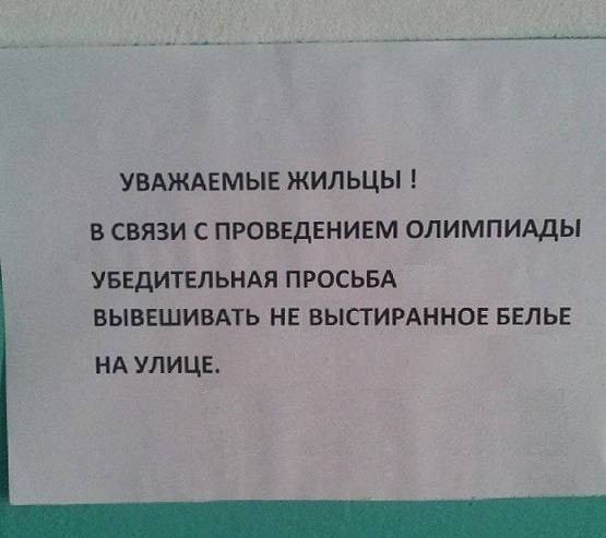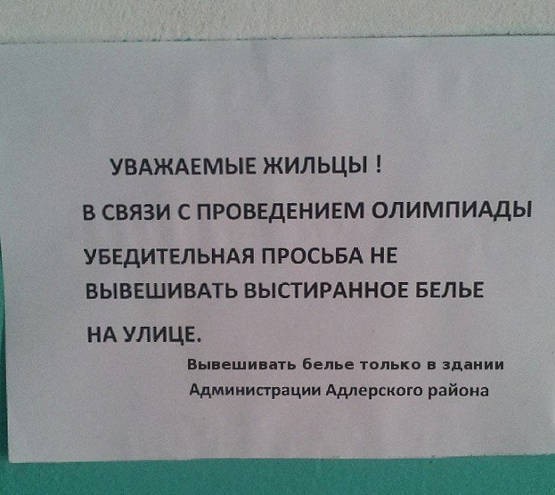 Во исполнение просьбы Администрации Адлерского района, жителям Адлерского района рекомендуется вывешивать на улице только грязное, либо не до конца выстиранное белье.
