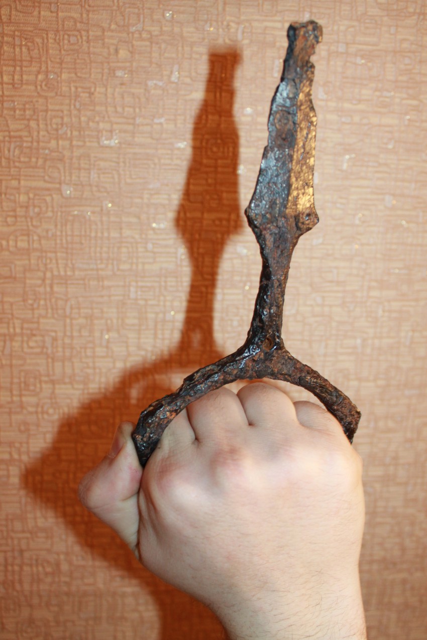 Держалась эта штуковина немножко не так. Жало зажималось между средним и безымянным пальцами. Кинжал получался продолжением руки. Обычно ним добивали поверженного врага. Такая странная форма была нужна, что-бы пробить доспехи(защиту). Обычно рукоять обматывалась кожаным шнурком.Отсюда и отверстие для крепления шнура.