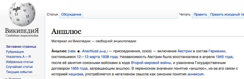 Есть политическое определения для двух этих понятий «аншлюс» и «аннексия», есть их дословный перевод. И не надо плохое знание истории трактовать как «в переносном значении». Посмотрите итоги референдума в Австрии по поводу аншлюса и всё поймёте. Страна которая блистала в Европе распалась и Австрия превратилась в посредственное государство, которое практически осталась без сырьевых ресурсов и разваленной промышленностью. И только союз с Германией гарантировал ей экономический подъём. К тому же пример самой Германии, которая при нацистах восстала из пепла и снова превратилась в сильную державу, ясно показывал австрийцам вектор движения на объединение с Германией.