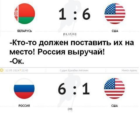 США сообщили о категорическом несогласии с так называемой «победой» сборной России в матче на чемпионате мира по хоккею. Об этом заявила спикер Государственного департамента США Дж.Псаки: «Этот матч не имел ничего общего с настоящим хоккеем. В 21 веке нельзя играть в хоккей так, как будто на дворе век 20-й. Имперские амбиции сборной России наглядно продемонстрированы в самих методах ведения игры, как это было в худшие годы существования СССР: грязная шайбовая карусель, которую устроила команда России в ворота сборной США и блокирование демократических шайб в свои ворота, это попытка пересмотра сложившегося статуса-кво и угроза общеевропейской безопасности.»