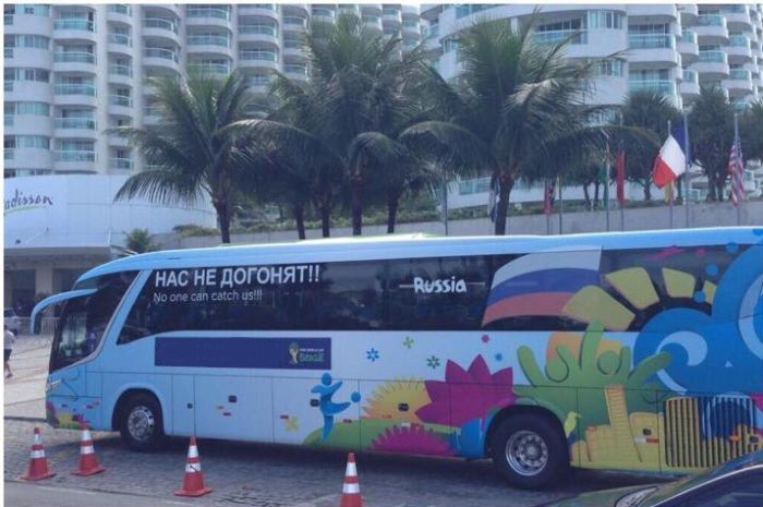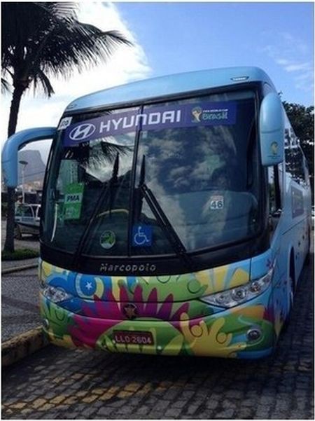 Автобус, на котором передвигается наша сборная по футболу в Бразилии во время Чемпионата мира по футболу 2014. Что в нем такого необычного?