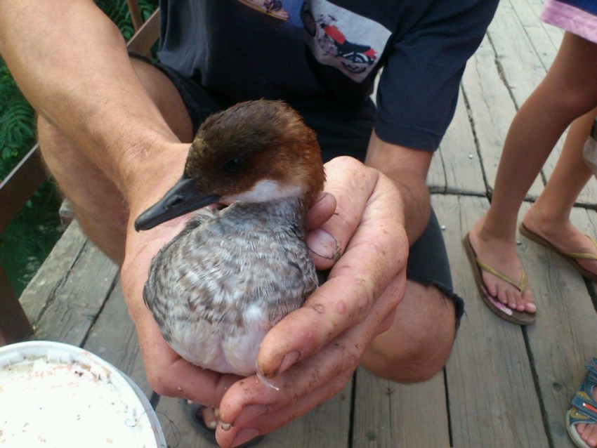 В Дагомысе несколько семей уточек живёт. Утята были разные по возрасту, но кормиться приплывали под мост, где рыбу хлебом кормят… Нам так один на крючок попался.