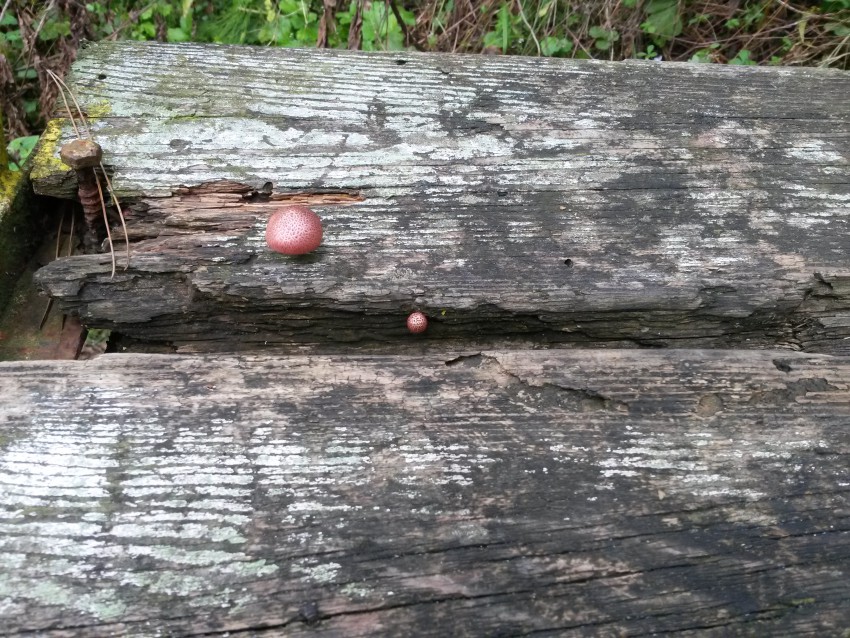 Они именно без шляпки, как шарики. На дождевики похожи, но вот цвет совсем не такой. Да и по размеру маленькие. Они на скамейке выросли. Там шуруп торчит рядом (для сравнения).