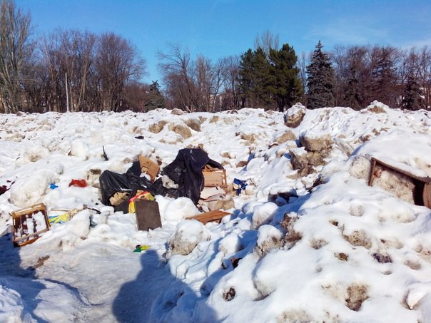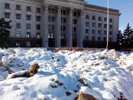 «Именно так сейчас выглядит Куликово поле в Одессе. Горы льда, грязи вперемешку с мусором были свезены на площадь перед Домом Профсоюзов. Я не помню ни одного года, за все 25 лет проживания в Одессе, чтобы из этой площади устроили помойку. Груды грязи навалены прямо под доской с фотографиями и биографиями погибших. Представить, чтобы тоже произошло, скажем, на месте падения небоскребов 11 сентября, чтобы администрация Парижа свезла мусор с города на место расстрела карикатуристов, чтобы в Беслане перед школой организовали городскую свалку…