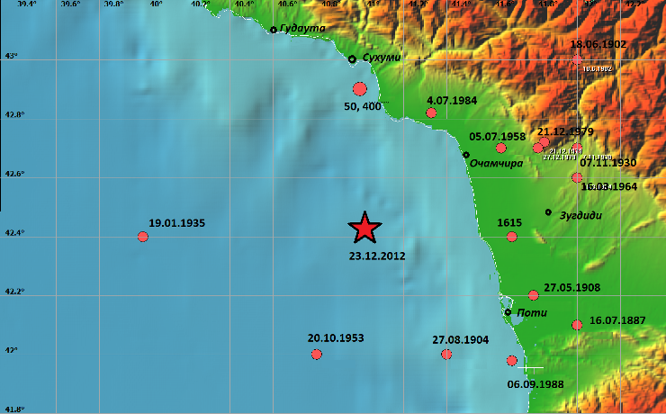 Исторические сведения В радиусе 50-70 км от эпицентра произошедшего землетрясения 23.12.2012 г. известны исторические землетрясения с М≤5.5 (рис). По данным «Нового каталога» (Кондорская, Шебалин, 1977) три из них были 8-ми балльными: 1) землетрясение в I в н.э. 50 г. с М=5.5, вызвавшее сотрясения, приведшие к гибели г. Диоскурия, оползни и возможно цунами, 2) землетрясение 400 г. с М=5.5 (примерно в этом же очаге), приведшее к серьезным разрушениям в г. Себастополис (Сухумская бухта) – были повреждены и наклонены крепостные стены, 3) землетрясение Цаишское 1615 г. с М=4.9. Кроме того, игзвестног Ачигварское землетрясение 5 июля 1958 г. с М=4.6 как 7-ми нбалльное в эпицентре. Ряд землетрясений – 27.08.1904, 19.01.1935, 20.10.1953 с М=4.2-4.7