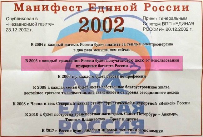 " Как вспоминает политтехнолог Вячеслав Смирнов, входивший тогда в предвыборный штаб «ЕР», манифест готовила группа под руководством социолога из Санкт-Петербурга Юлии Крижанской (на тот момент замглавы исполкома «Единой России»). Ее начальник Александр Беспалов рассылал документ по региональным отделениям. Как гласит легенда, проект был настолько одиозным, что Юлию Крижанскую после публикации манифеста из партии выгнали, еще на пять руководителей региональных исполкомов завели «персональные дела». Впоследствии лишился должности и Александр Беспалов. В 2003 году член президиума генсовета «ЕР» Олег Морозов назвал обещанное в манифесте «бредом сивой кобылы»."