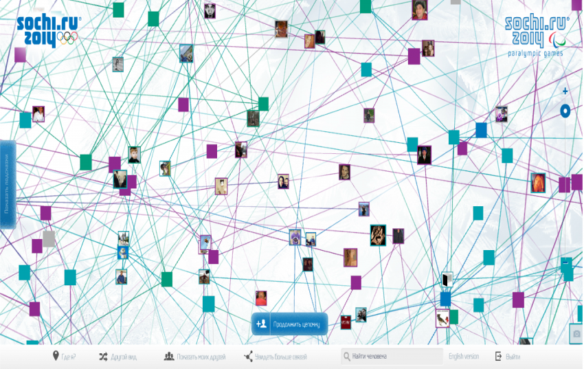 Необычный сервис от организаторов Сочи-2014 — вы поздравляете друзей с Новым годом и становитесь участником огромной паутины поздравлений! Дальше вы можете следить за тем, кто продолжает нить вашего поздравления и как далеко она протянется! Посмотреть, как все это работает, можно здесь