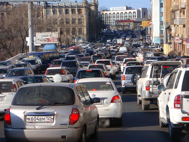от бухты Золотой Рог начинается Океанский проспект, который переходит в проспект 100-летия Владивостоку. Тянется на 60 км до аэропорта вдоль береговой линии моря. Параллельно идёт железная дорога вдоль моря. Население Владивостока около полумиллиона, а автотранспорта почти 400 тысяч единиц. Правда, много стоит на авторынке и парковках, но всё равно много машин в городе