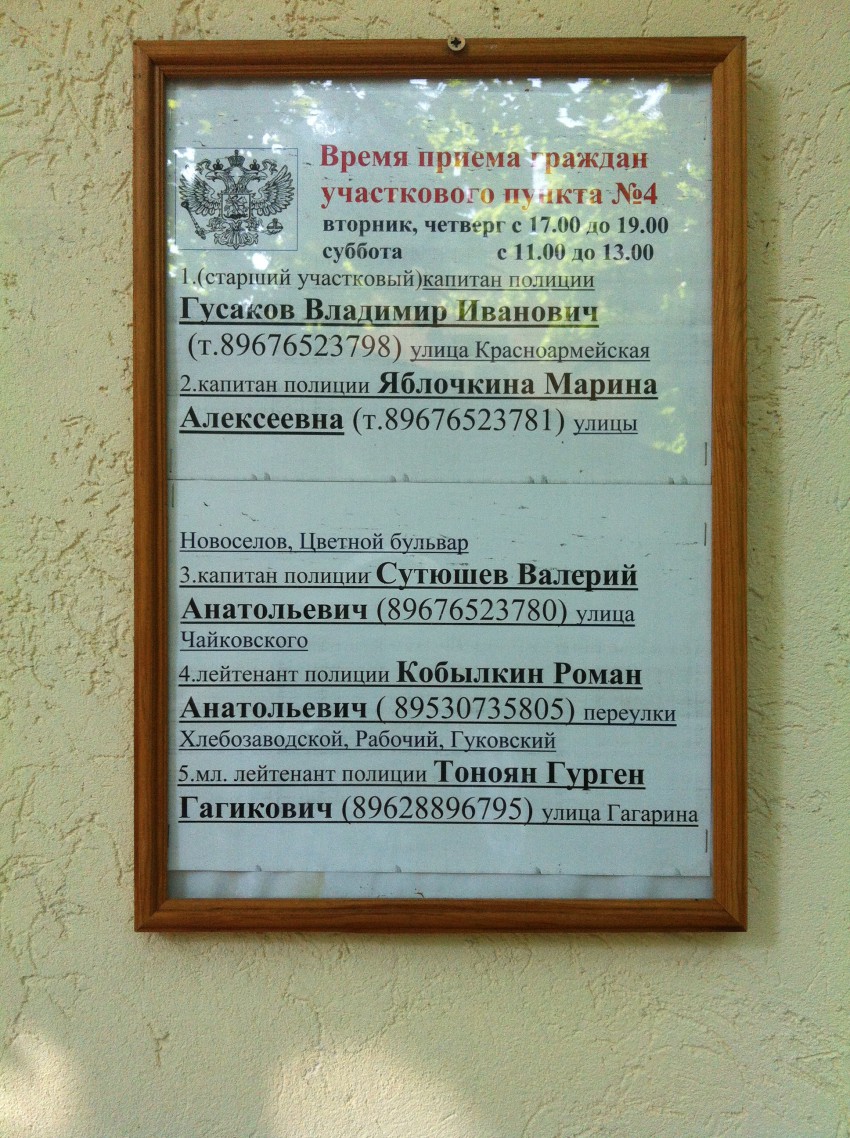 Вот данные на участкового по Рабочему переулку. Был у него по проблеме захвата дороги на переулке под парковку, обещал прийти и разобраться. И всё! Стало только хуже. Скоро там даже пройти будет невозможно. И всё при полном бездействии властей!