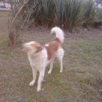 Дворняга, был крупный 35-40 кг., окрас бело рыжий мальчик, пушистый,