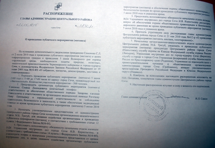 Распоряжением главы администрации центрального района города Сочи №412-Р от 21.05.2010 г. мероприятия согласованы. Сомневающиеся могут позвонить в администрацию и уточнить.