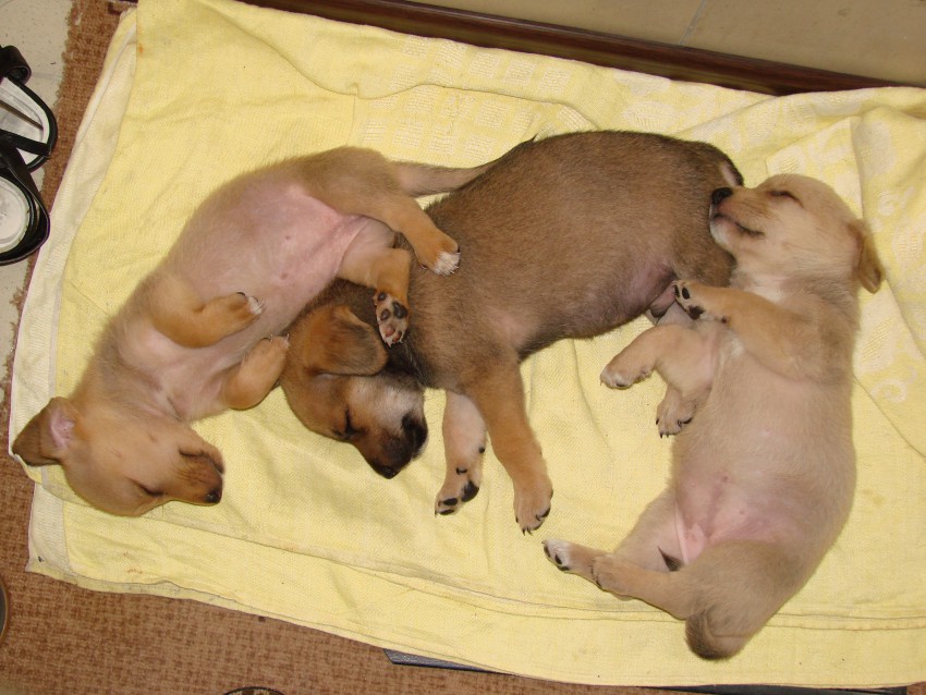 Так они и оказались у меня. На удивление очень быстро нашлась кормящая сука, правда своего щенка она уже выкормила и надежды у нас было мало, но она их приняла! Один щенок умер, видимо был самый слабый. Она кормила их практически две недели, но сейчас уже больше не хочет, всячески игнорирует щенков. Нужна новая кормящая сука, хотя бы еще на 2 недели!!! Щенки от некрупной собаки, хорошенькие, упитанные колобочки. Буду их пристраивать как только подрастут.