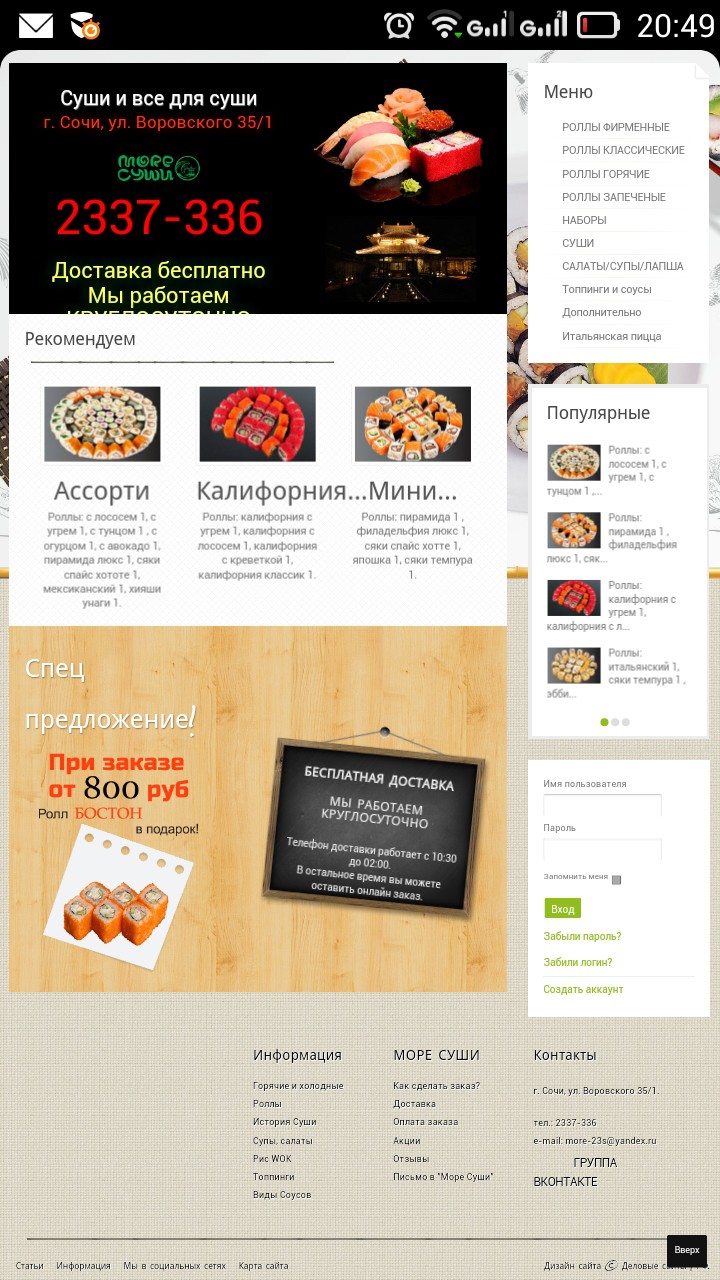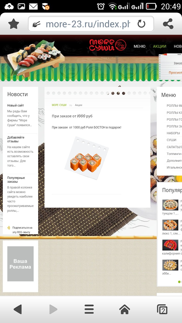 Зашла в привет, написать топик о море суши, и наткнулась на ваш ))) вчера тоже нас неприятно удивили. В акции написано про ролл Бостон, которого тоже не было привезено нам, приборов просили 6, привезли 3, да ещё и за контейнер для горячих ролл содрали 45 руб!!! Оператор хам, и телефон руководителя не даёт. Нужно к ним наведаться и написать в их книге жалоб и предложений.