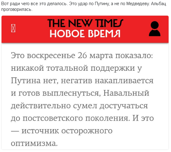 Это было ясно сразу. Навального крышует медведевское либеральное крыло власти. Фильм его про Медведева ни о чем, там нет компромата на Медведева.