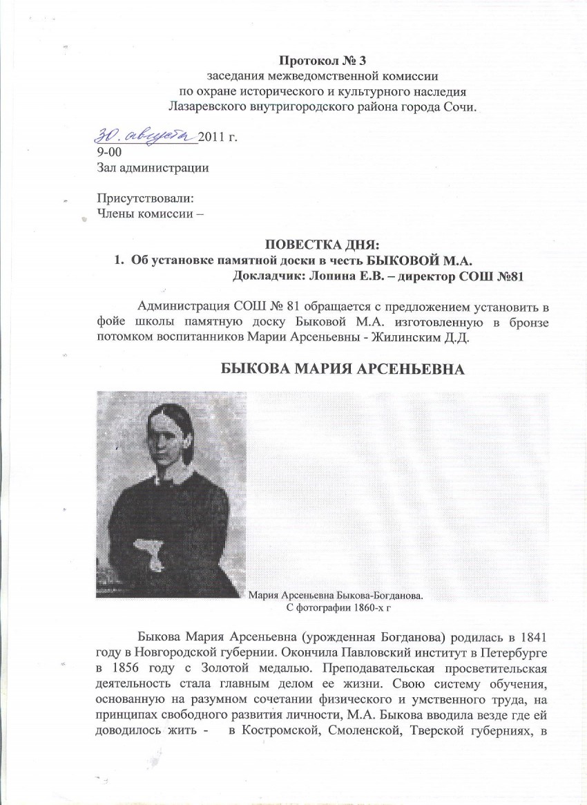 Как обещал выкладываю информацию о положении дела по установке памятной доски первой учительнице Сочи М.А. Быковой.