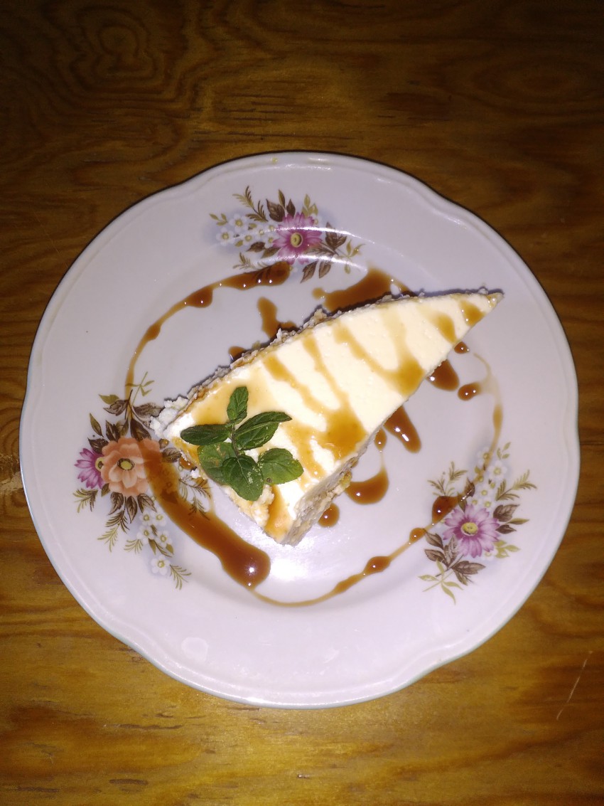 Печенье в блендере перемешать с маслом, выложить в форму, утромбовать. Опять же в блендере перемешать творог, сахар, сметану и предварительно растопленный желатин. Все это залить в форму с печеньем. Поставить в холодильник до застывания. Получается не хуже, чем в кафе