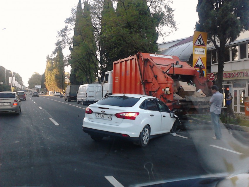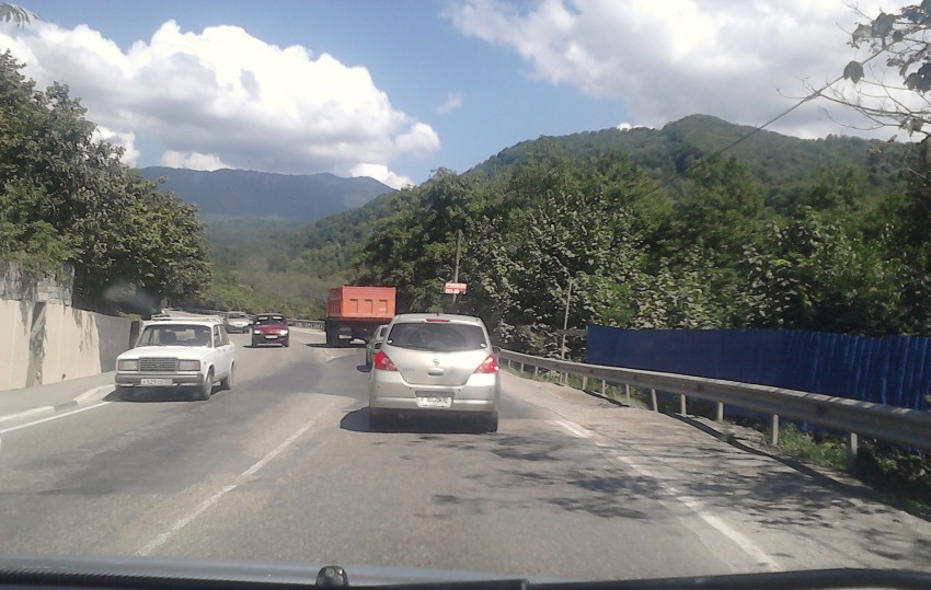 7.50 утра. Пробка уже от Кудепсты в Адлер. Причина — автомобиль «Форд» боднул Камаза.