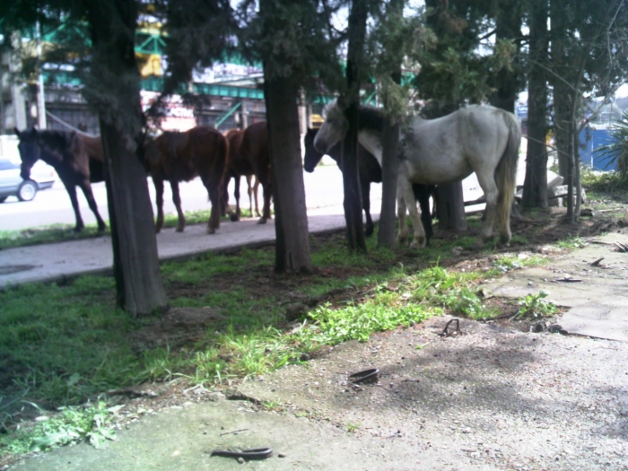 Хозяину просто нечем кормить бедных лошадек вот он и выпустил их покормиться в город но и в городе теперь нет зелени и бедные лошадки поэтому голодают!