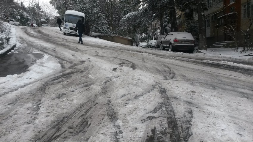 На фото автобус занесло на скользкой дороге. Будьте осторожны