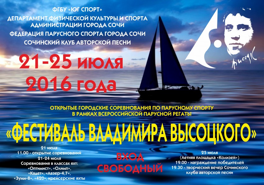 К этой дате в Сочи приурочены два больших мероприятия: парусная регата «Фестиваль Владимира Высоцкого» и творческий вечер Сочинского клуба авторской песни. Соревнования сильнейших сочинских яхтсменов пройдут с 21 по 24 июля.