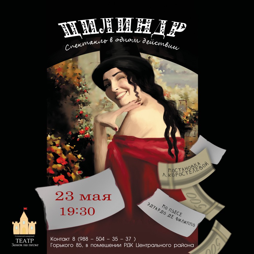 Сочинский камерный театр «Замок на Песке» приглашает жителей и гостей г. Сочи на веселый, эмоциональный спектакль по пьесе Эдуардо де Филиппо «Цилиндр», в котором кипят настоящие итальянские страсти. История нескольких добродушных безработных оказавшись без средств к существованию, которые пускаются в феерическую авантюру, дабы расплатиться с долгами… позволит Вам искренне сопереживать вместе с героями и получить настоящий заряд положительных эмоций и позитива!!!