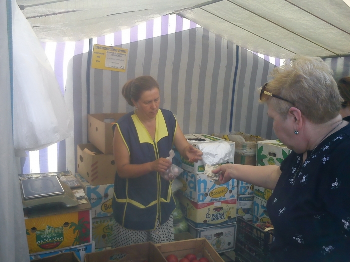 Покупаем овощи и фрукты. На рынке не обманули, куцие пучки зелени лежали на прилавках. Цены на качественный продукт мало чем отличаются от рыночных. Внешний вид многих продавцов был расхлябан и неприветлив. Едва начал щелкать фотоаппарат, лица с яркой, но не кубанской внешностью побежали в дирекцию ярмарки.