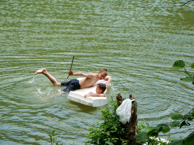 Озеро и сегодня встречает гостей. Вот купаются дети. А этот мальчик, которого отец привез на скутере, играет с радиоуправляемым катером.