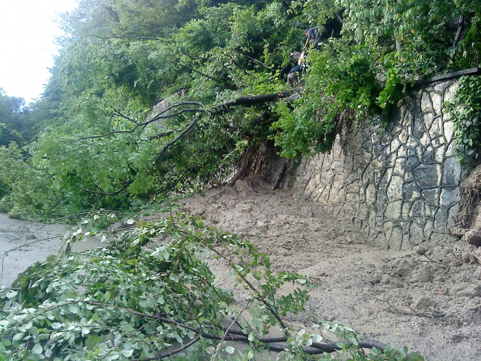 Только что проходил мимо. Въезд так же зактыт, стоит дпс. Рабочие убирают грунт и деревья с дороги и из за стены. Снизу видно что вверху из под дороги ушел грунт и часть асфальта висит в воздухе.