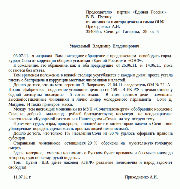Многогранный Приходченко (добавлено письмо к ВВП)