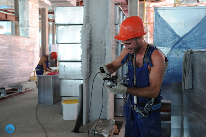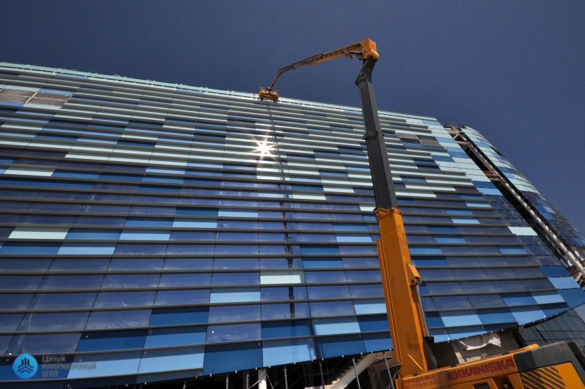 за девять месяцев смонтирована самая верхняя часть — «макушка» купола кровли, которая находится над главным хоккейным полем Большой ледовой арены. Стартовал монтаж боковых поверхностей купола.