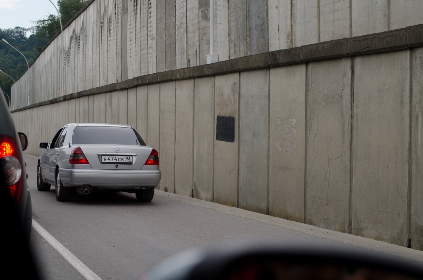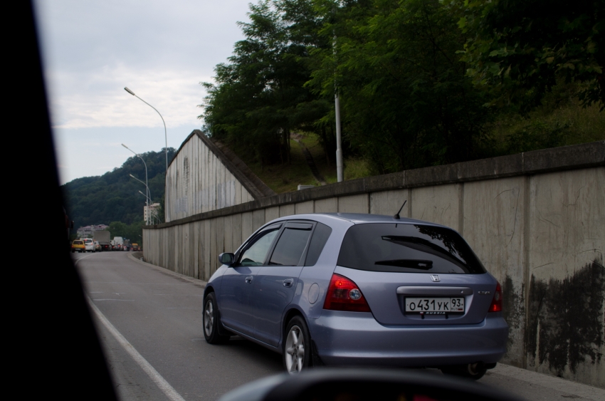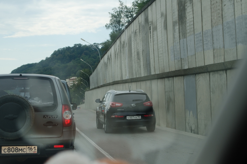 Едем дальше. Кто ездил летом из Краснодара меня поймёт. Далеко перед постом начинается пробка, которая тянется до Джубги. Там очень много любителей погонять по обочине. А теперь представьте, что вы едете на машине без кондиционера, на улице дикая жара, окна открыты, а по обочине летят джигиты поднимая столбы пыли, закрывающие видимость и оседающие внутри салона.