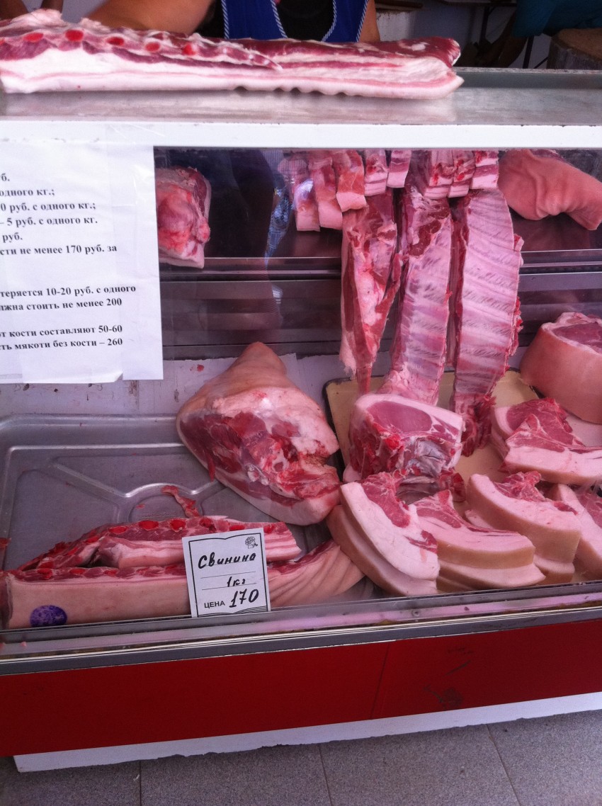 а свинина и впрямь ужасная. я обычно покупаю порезанные дольками куски на кости (свинная котлета) — так тут на ней слой сала в два пальца толщиной, что видно на ваших фото… В общем, мясо лучше покупать в магазине, хоть и подороже.
