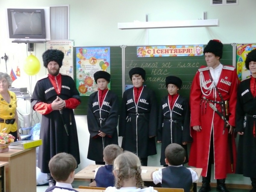 Дети идут в школу получать знания, настраиваются на это. Школа их торжественно встречает. Ну, при чем тут ЭТО? Чтобы перваки захотели шашку и бороду и знали, что именно ЭТИМ они будут заниматься в школе?