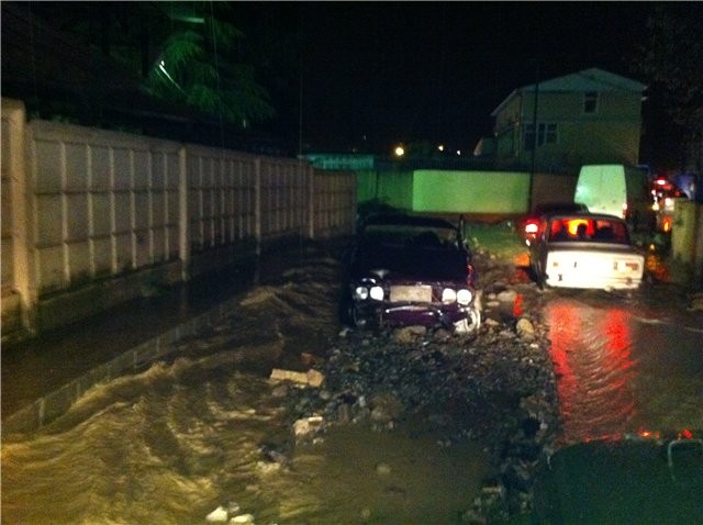19-00 «гортоп» затоплен, территория СТО покрыто 1.5 м слоем воды… ливень льёт вода прибывает… отчаянные таксисты пытаються проехать в итоге не получаеться плывут, бьються об стену и кое как разворачиваясь убегают обратно на виноградную…