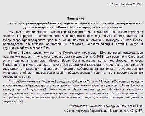 Об этом свидетельствует принятое 3 октября 2009 года «Заявление жителей города-курорта Сочи о возврате исторического памятника, центра детского досуга и творчества «Вилла Вера» в городскую собственность».