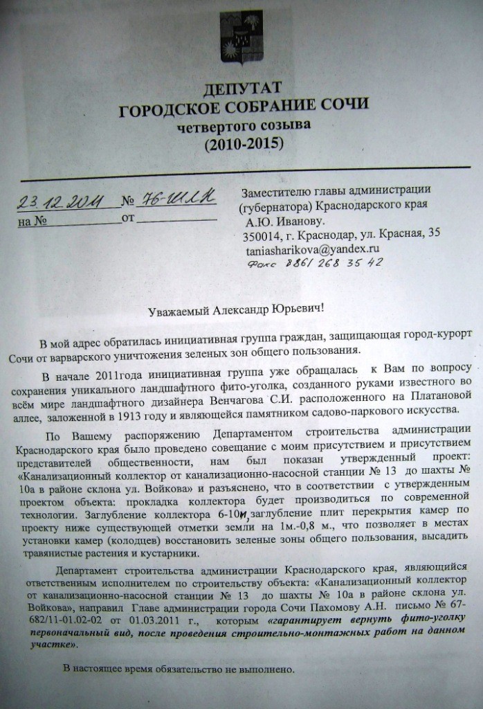 На сегодняшний день речь о восстновлении фито-уголка С.И. Венчагова в первоначальном виде не идет. Почему нужна спешка восстановить все до 28 декабря 2011 года. Только для того, что бы потом сказать, что вот сочинцы обнаглели совсем. Премьер-президент ВВП для них старается — нате вам, пользуйтесь инфраструкторой, а они про какие то фитоуголки бузят. Кушайте то, что дали.