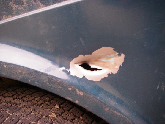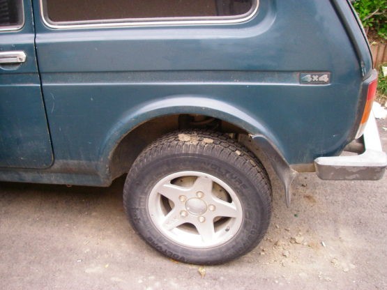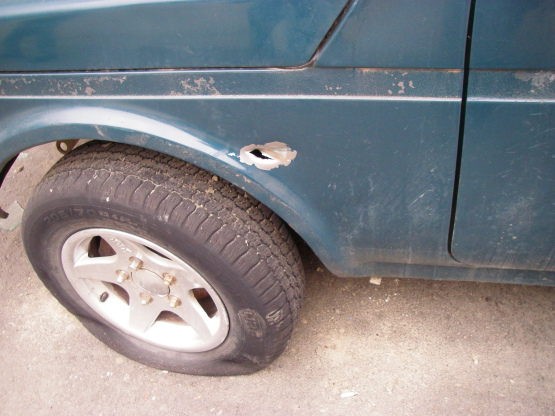 Переднее колесо (пробито или спущено — не скажу, но над ним след осколка)