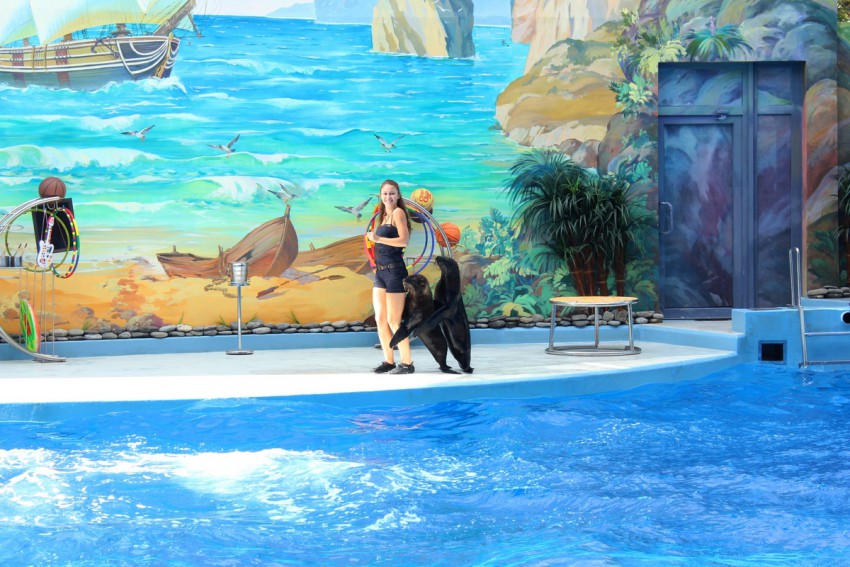 Он стал самым большим в России. Площадь бассейна дельфинария — 525 кв. м, глубина — 6,4 метров. Сейчас там проживают три дельфина, два морских котика и детеныш морского льва.