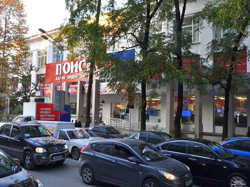 Магазинчики, кафе, тесно лепятся на этой улице, создавая колорит китайского Шанхая. Разрывов между строениями нет, вот и стоят стена к стене, забыв о пожарной безопасности. В Сочи главное красная крыша, это основное определение общего олимпийского архитектурного облика, все остальное незначительно. Подобное скопление всякой разности, составляет гордость кубанских сельских поселений и называется у них торговый центр.