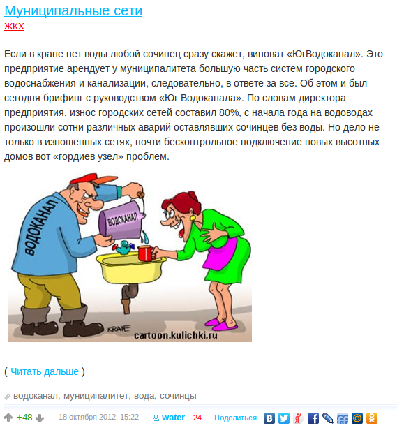 Кстати, не хочешь пояснить твоим соседям-«собственникам»-зачем, и по чьему заказу,- ты вообще заварил этот дешевый наезд на Водоканал?!)… И на сколько теперь, благодаря полученным тобой деньгам, отсрочится решение их проблем?!