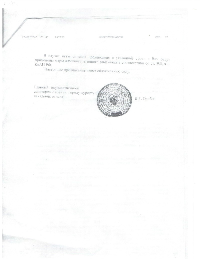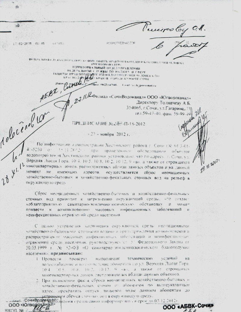 «С целью устранения загрязнения окружающей среды неочищенными хозяйственно-бытовыми сточными водами и предупреждения возникновения и распространения массовых инфекционных заболеваний… предписываю при выявлении факта сброса неочищенных хозяйственно-бытовых и хозяйственно-фекальных стоков с абонентов по указанным адресам прекратить отпуск питьевой воды данным абонентам до устранения сброса сточных вод в окружающую среду», — сказано в предписании Роспотребнадзора.