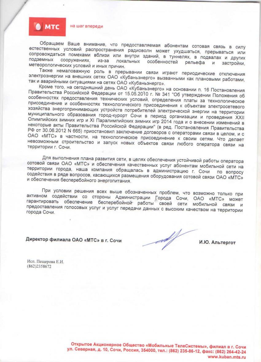 Вы, уважаемый, поняли из письма МТС лишь то, что хотели или смогли понять. Прочтите внимательно последние абзацы — как мягко отсылают Вас в администрацию Сочи (и не только), не заметили? Вы думаете, просто так? Они намекают, что посмотрите, дорогой, вокруг — что творится в городе касаемо установки базовых станций, антенн, законности этих установок, бездействие администрации,… что откаты нынче настолько высоки, что МТС, как НЕ оператор Лимпийских игр в Сочи, не может позволить себе установить лишнюю базовую станцию, нет возможностей/разрешения модернизировать сеть, в отличие от оператора ОИ-2014 сети Мегафон, которому покровительствуют всякие органы и другая властьдержащая расчленёнка, и которому дан карт-бланш в городе.