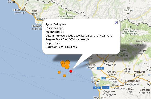 Tuesday December 25 2012, 22:44:33 UTC 28 minutes ago Black Sea, Offshore Georgia 5.2 10.0 CSEM-EMSC