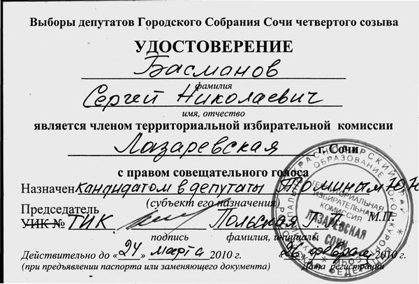 Дело в том, что председатель ТИКа Польская Галина Петровна никак не хотела признавать мои полномочия члена ТИКа с совещательным голосом, назначенного КПРФ, требуя чтобы меня назначил лично один из кандидатов. Надо сказать, что Лазаревская прокуратура заняла ее сторону, и мне пришлось предоставить документы о назначении меня независимым кандидатом в депутаты Томиным Юрием Юрьевичем.