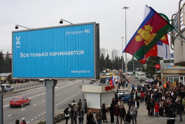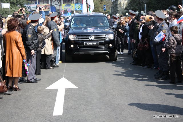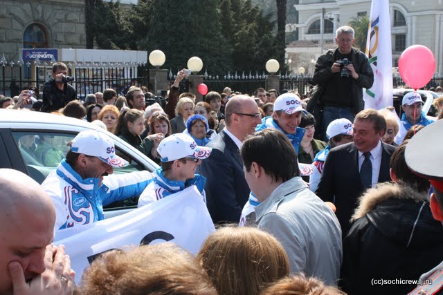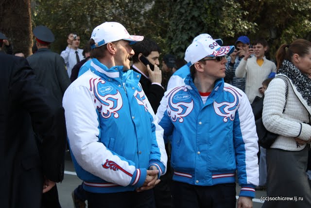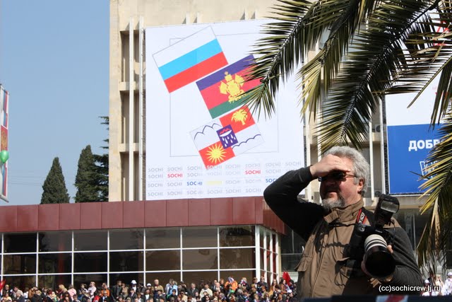 Многие говорили, что мол, насильно людей заставляли идти. Да, там было очень много учителей. Да, пришли они добровльно-принудительно. Но было еще очень много сочиннцев которые пришли сами, без помощи КГБ. Толпа была нереальная. И как ни странно, прием сочинцев был на удивление теплым. Погода, что ли такая… Не знаю почему, но и по количеству людей, и по громкости аваций, это мероприятие было круче презентации логотипа и записи передачи флага вместе взятых!