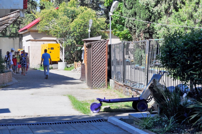 Вот такую картину видят гости и жители курорта, заглядывая за забор места культуры и отдыха. Пеньки, глина, недоделанный туалет, задние стенки сараев из шифера, тенты аттракционов. Прекрасный вид с федеральной трассы. Что-то здесь не видно созидающую руку паркового руководства.