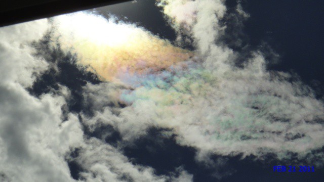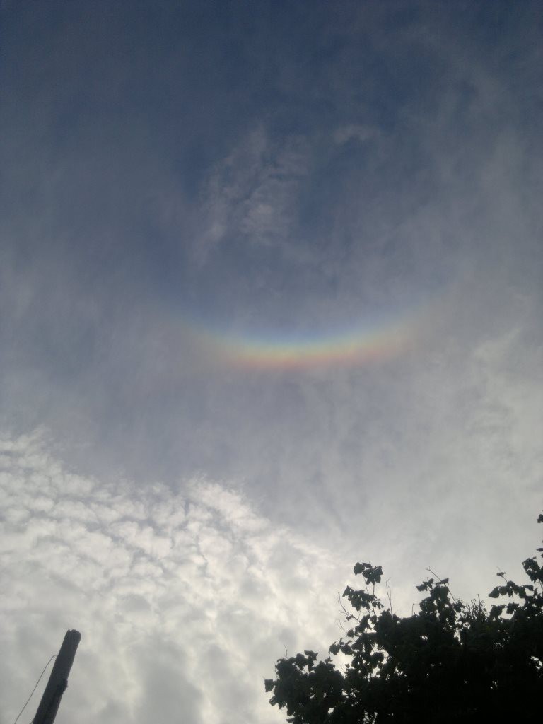 Очередные фотографии разноцветного оптического феномена сделаны в районе Объездной. Возникают гало в атмосфере вследствие преломления и отражения света ледяными кристаллами, образующими перистые облака и туманы.