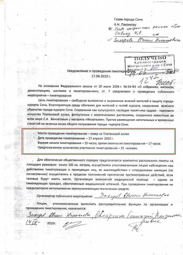 ЧЛЕНАМИ ИНИЦИАТИВНОЙ ГРУППЫ В АДМИНИСТРАЦИЮ РАЙОНА И ГОРОДА ПОДАНО УВЕДОМЛЕНИЕ О ТОМ, ЧТО, 17 АПРЕЛЯ 2010 Г. В СУББОТУ С 15-00 ДО 17-00 БУДЕТ ПРОВЕДЕН ПИКЕТ ПО ЗАЩИТЕ ФИЛАТЕЛИИ, ПАМЯТНИКА АРХИТЕКТУРЫ «ПЛАТАНОВАЯ АЛЛЕЯ».