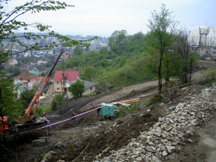 По склону заливают бетонную подпорную стенку.